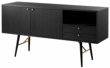 | Materiaali: | Runko ja etupaneelit mustasta MDF:stä messinkikahvoilla. Jalakset on valmistettu mustasta metallista ja messinkistä. |